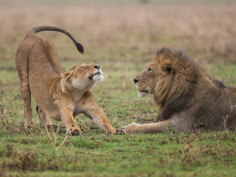 Für Löwen bedeutet die Migration ein Fest: Nahrung im Überfluss, Revierkämpfe, dramatische Jagdszenen. Besonders in der Zentral- und Ost-Serengeti sowie später in der Masai Mara lassen sich ganze Rudel beim Jagen, Fressen oder Dösen im Schatten beobachten – ein faszinierender Einblick in das Leben der Könige der Savanne zur intensivsten Zeit des Jahres.